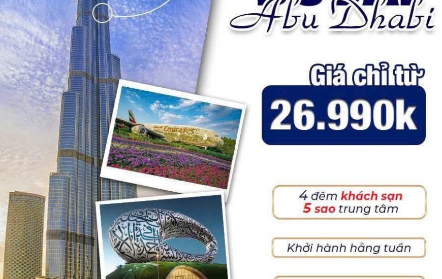 13:00: Quý khách tập trung tại sân bay Tân Sơn Nhất, làm thủ tục khởi hành đi Dubai trên chuyến bay EK 365 SGNDXB lúc 16:50 – 21:25 (Hãng hàng không 5* của Tiểu Vương Quốc Ả Rập Thống Nhất). Trên máy bay, Quý khách sẽ được phục vụ bữa ăn tự chọn theo thực đơn Âu – Á phong phú và hấp dẫn. ( Từ Tháng 01/2026 sẽ thay đổi giờ bay thành 18:00)